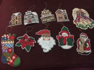 Another tradition is the ornaments I make for the roommates – can’t show this year’s yet, but here’s some of my past efforts. I love doing the counted cross-stitch and it definitely keeps me from snacking.